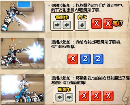 向前滾來避開對方的攻擊,滾動的同時向後發射2發魔法彈,在滾動時可貫穿對方。若在覺醒後使用,魔法彈就會貫穿所有敵人。 |