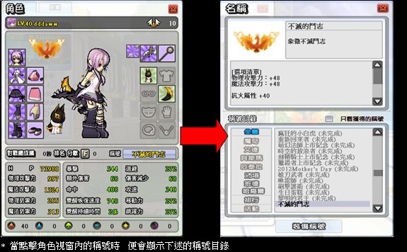 《稱號系統》 當角色滿足了特定的條件時,角色視窗中的[稱號目錄]將會顯示出可以進行的稱號任務內容,當任務完成後 ,即可獲得該稱號,並擁有稱號所附加的能力值。 ※ 詳細說明: 1. 已獲得的稱號可以隨意變換,將視角色選擇的稱號來附加其能力值,各稱號效果不重疊。 2. 變換稱號方法:直接點選[稱號目錄]中欲使用的稱號即可變換。