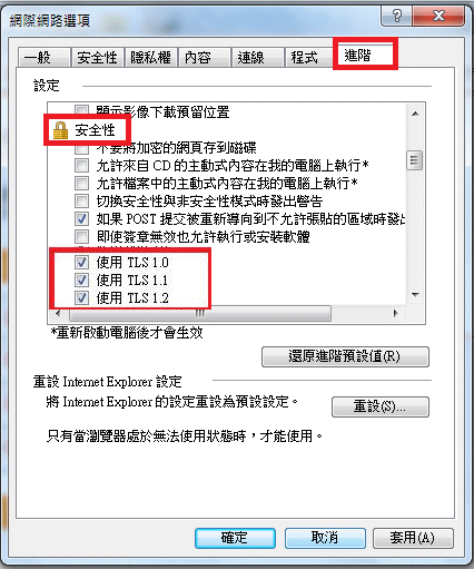 (2)點選進階(頁籤) à 向下滾動尋找"使用TLS1.0" 並將內容打勾