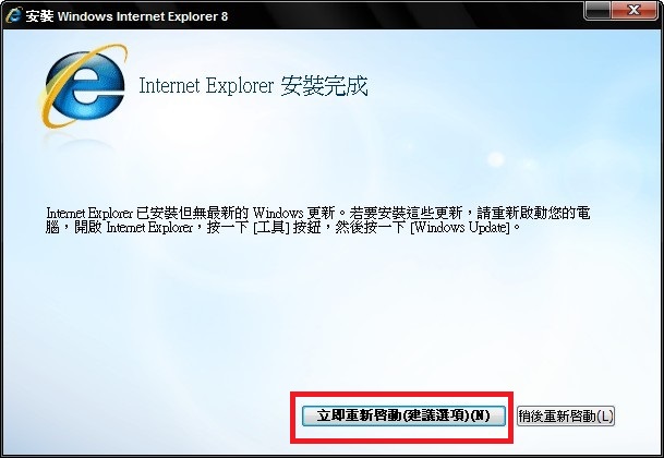 (3)完成之後按一下〔立即重新啟動〕,電腦重新開機IE8.0才會正式運作。