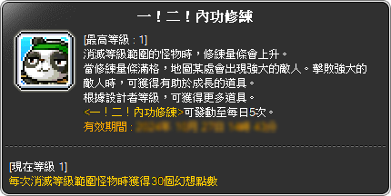 🍑每狩獵1000隻怪物,會發動一次技能<一!二!內功修煉>,並召喚出特別的怪物,擊敗後會掉落各種成長道具。