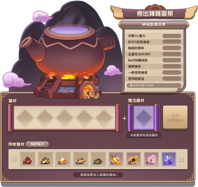 🍑將藥材加入鍋中,可以隨機調配出不同能力的神秘靈藥Buff。