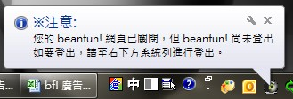 8. 請確認『登出』beanfun!樂豆,如果出現下圖提示訊息,請將帳號登出。