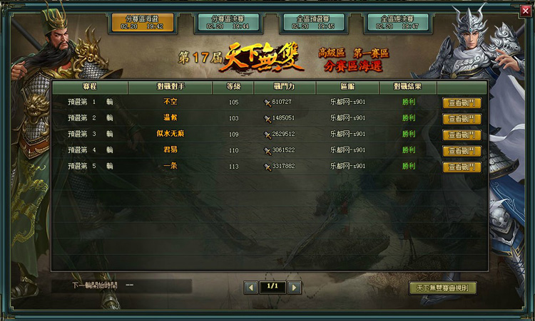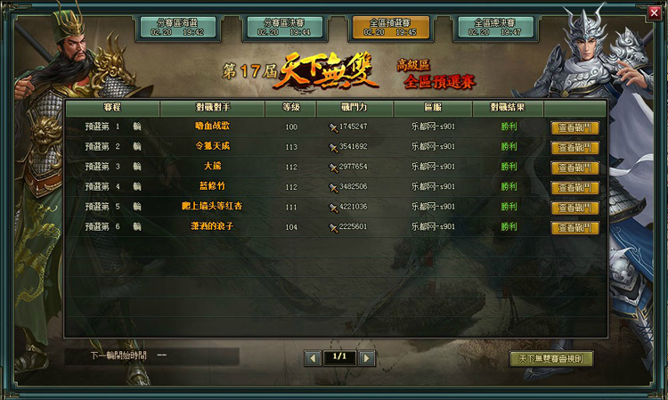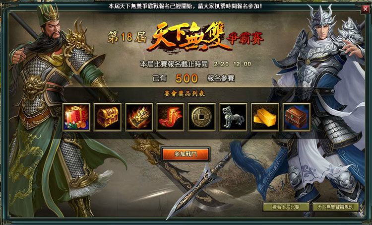 - 沒有報名的玩家,在比賽開始後也可以打開天下無雙介面觀看後續比賽。