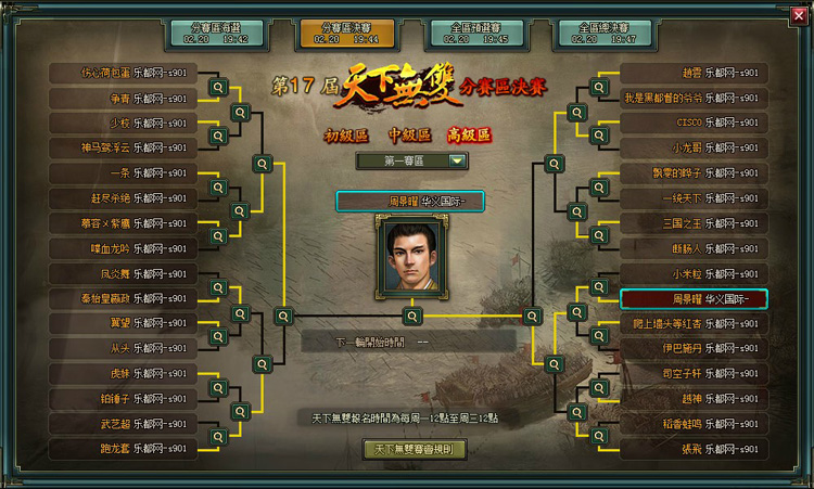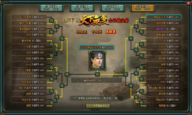 - 分賽區決賽階段玩家點擊主介面中的“天下無雙”按鈕,打開天下無雙分賽區決賽介面。若玩家有參加本屆比賽,則默認選擇自己所在的賽區。若玩家沒有參加比賽,則預設顯示第一賽區初級區。