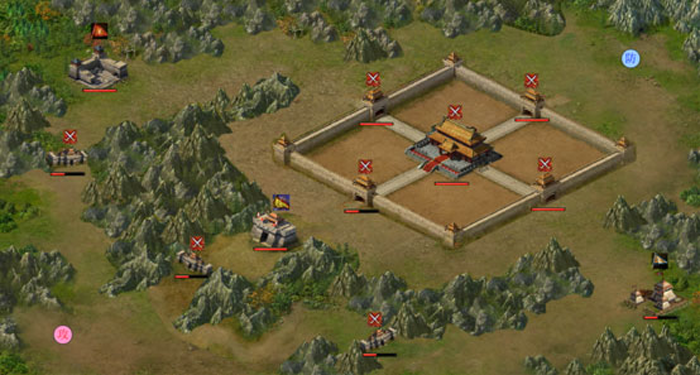 圖中四四方方用城牆隔離、防守嚴密的就是我們的名城,中間的官府就是大BOSS的所在,四周的城牆對於攻擊者是無法穿越的障礙哦,城牆有4個城門,攻方有多條線路多種選擇抵達州城,怎樣才能抵達勝利就看你的文韜武略了~