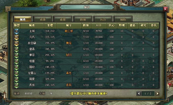 1.新增“統計”功能,更加方便玩家管理自己的城池。