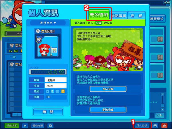 ◎請點選[個人資訊]>[我的資料]即可開啟[公會視窗]。