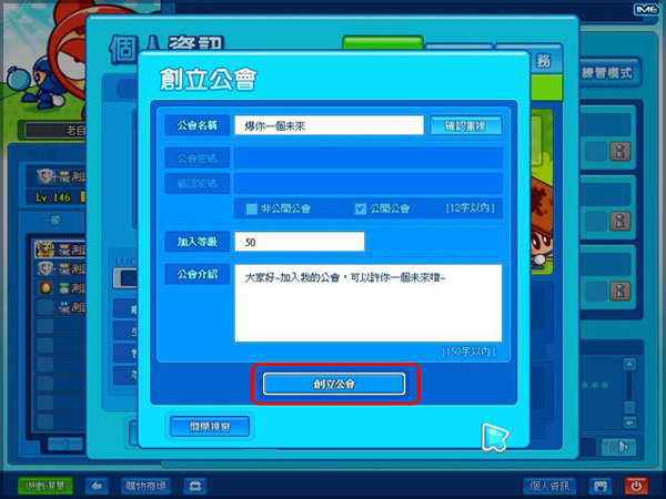 3.公會資料填寫:公會名稱(3~12個字元)、加入等級(公會成員申請加入時的等級限定)、公會介紹(限150字以內)