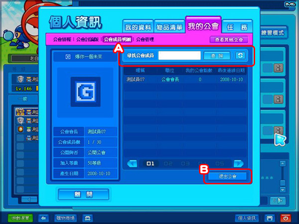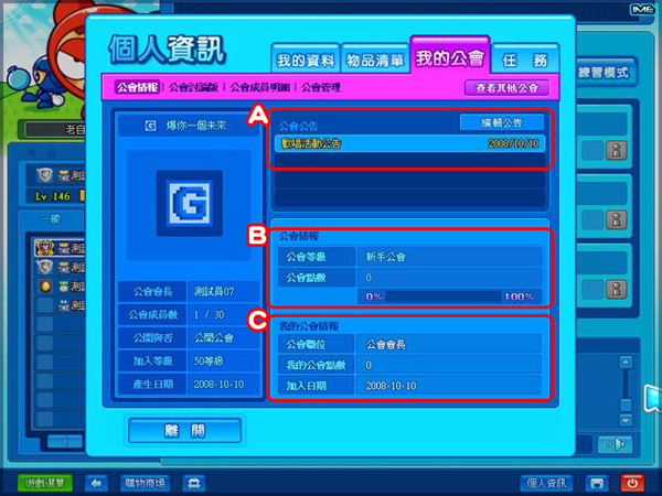 B.點選[退出公會]按扭,即可[退出公會]或[解散公會]。(除公會會長外沒有任何一位公會成員時,才可解散公會) |