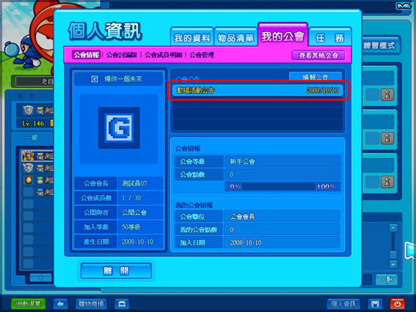 ◎當角色已加入公會成功,[個人資訊]將會出現[我的公會]介面。 |