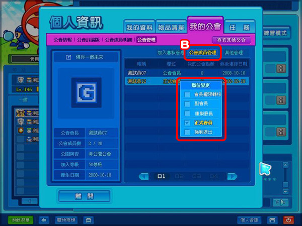 B.[公會成員管理]:公會會長滑鼠右鍵點選公會成員後,即可變更[會員職位]或[強制退出]會員。 |