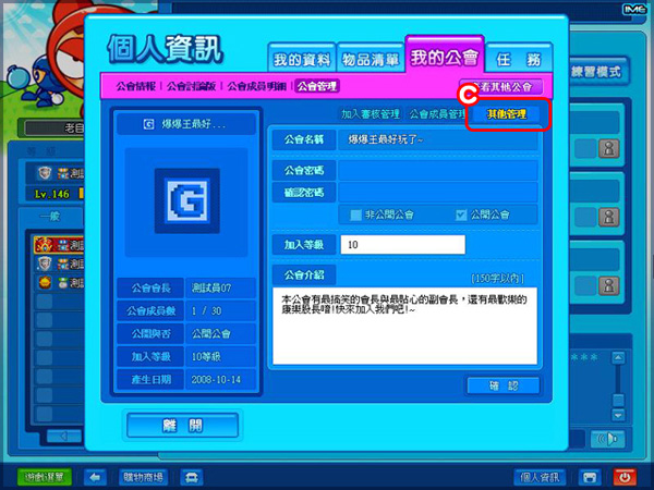 C.[其他管理]:若要變更創立公會時填寫的相關資料,利用此頁面功能即可變更唷! |
