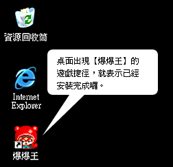 請取出包裝中所附的遊戲光碟,放入您的電腦光碟機中,點選遊戲安裝,依照安裝程式的指示點選下一步(NEXT),安裝完成後,您的桌面將會出現【爆爆王】的遊戲捷徑,就表示已經安裝完成囉。