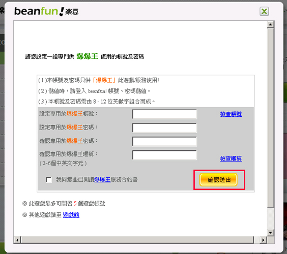 4.依據網頁說明,分別輸入帳號、密碼和暱稱,並勾選同意合約書後,按下送出即可完成申請。