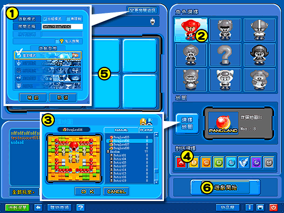 對戰房間中的等候室中,室長可以選擇要對戰的遊戲地圖,也可以使用『變更房間資訊』功能變更房間設定,所有的玩家可以自由選擇自己想使用的角色。