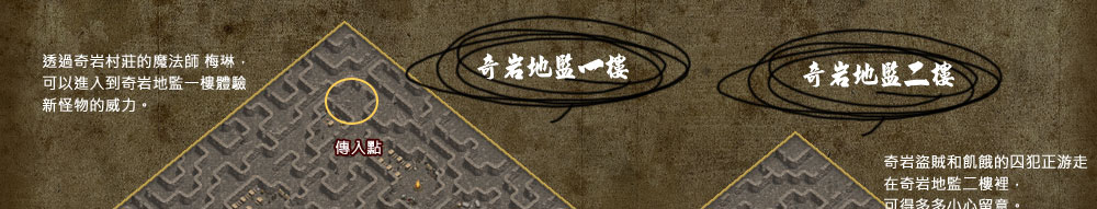 | 不過,「奇岩地監」曾經是關押著亞丁王國最惡毒罪犯的監獄,象牙塔魔法師 梅琳奉了亞丁國王的命令,召喚了許多怪物至地監中,並加了「無法突破的迷宮結界」,但無知的強盜們,在探索奇岩地監時點亮了火把,並一路上做了自己的記號,結果,導致怪物們突破了迷宮的結界,罪犯靈魂也趁此在地監裡遊蕩漂泊著。 |