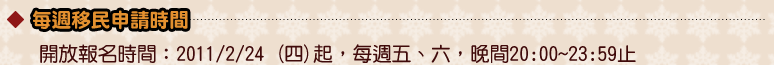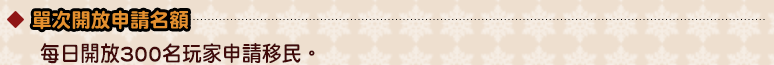 為不影響每日正常伺服器維護時間,每日開放移民的名額限300名,若當天名額已滿,玩家須於下次申請時間才能提出申請。 |