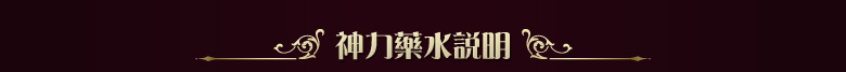藥瓶 | 1個「藥瓶」搭配1個「人蔘」或1個「靈芝」向「神力藥水兌換專員」兌換後, 可以得到「神力禮盒A」或「神力禮盒B」。不可刪除、不可轉移、不可溶解、 不可封印。 |