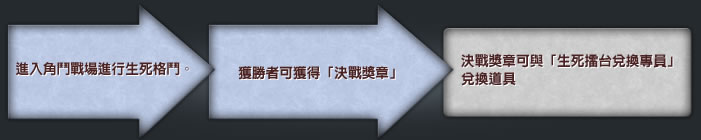 獲勝者可獲得「決戰獎章」,決戰獎章可與「生死擂台兌換專員」兌換道具,兌換數量及內容物請見活動道具說明頁。