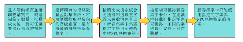 - 抽獎完成後系統會將獲得的道具以及新春集字卡直接置入遊戲角色身上,新春集字卡集滿指定字串可至遊戲中找NPC兌換寶箱。