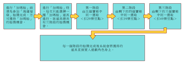 - 參加「加碼抽」時,每次只能選擇一種「加碼抽」道具進行抽獎,總共有三階段的抽獎機會。若過程中不論因素視窗遭關閉,將無法繼續銜接上一次中斷的加碼抽。