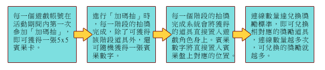 - 每一個遊戲帳號在活動期間內第一次參加「加碼抽」,即可獲得一張5x5賓果卡。