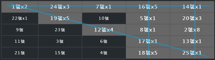 - 若同一條連線上的所有號碼,都擁有2個以上的數量,每一次領獎時只算一條,例下表1號x2、19號x5、12號x4、17號x1、25號x1這條連線。