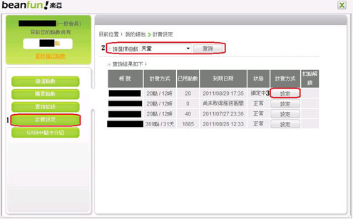 - 進入「樂豆錢包」後,請點選【計費設定】,選擇遊戲「天堂」點擊【查詢】,再選擇欲進行變更計費方式的帳號,點擊【設定】。