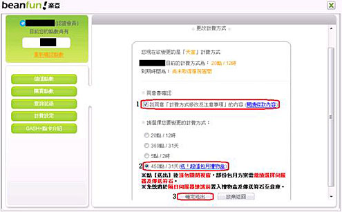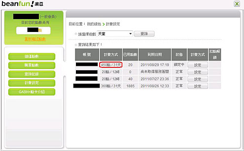 - 按下確定後,即可確認自己所選擇的遊戲帳號計費方式是否已變更為【450點/31天】,而系統將於「扣點完成後」一日內將道具置入至倉庫中。