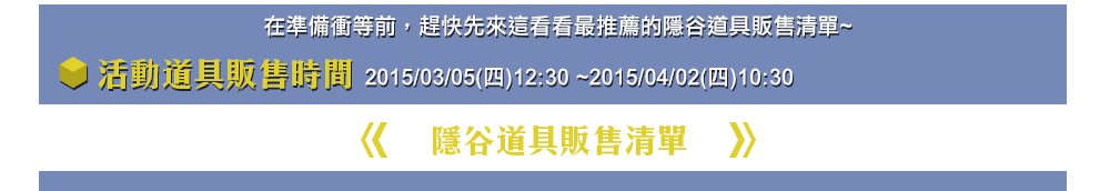 | 歡樂全程組 | 1,800 | 內含【榮耀隱谷全程券】1張、【神力藥水250%】100罐 ※道具將於2015/04/15(三)維護時回收。 |