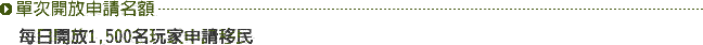 為不影響每日正常伺服器維護時間,每日開放移民的名額限1,500名,若當天名額已滿,玩家須於下次申請時間才能提出申請。 |