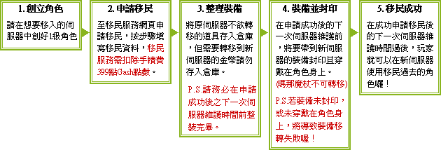 常態移民服務僅能轉移角色的等級、屬性(包含已學習的法術)、「裝備」於身上且「已經封印」的道具(瑪那魔杖不得轉移)、角色身上天幣(限轉1千萬元以內),其餘複合性物品(藥水、卷軸…)、可堆疊、不能封印或不能裝備之道具..等將無法轉移至新伺服器中,故多出來的道具、金幣,請玩家存入倉庫中,以免造成損失。(魔法娃娃封印後將無法存入倉庫,提醒玩家於移民前,請先將魔法娃娃解除封印後存入倉庫。),請玩家報名前務必確認清楚!! |