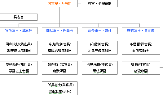 位於冥皇的地位,同時也立於侍奉格蘭肯的第一司祭(大神官)之位並率領著四大冥王,其獨立的『暗殺者旅團』為自身的直屬特務部隊。