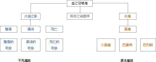 然而由於進行魔物不死化的催生與解開被封印的魔族而讓血之召喚者的力量變弱之際,對於不死魔族的存在竟然已經威脅到目前魔族的地位這件事情感到不滿的『炎魔』將把有生命的魔族聚集起來,稱為『原生魔族』,並領導他們對血之召喚者進行反抗,血之召喚者終結炎魔的叛亂後,催生代表他意志的『火焰之影』用以支配混沌、墮落、死亡之後便進入冬眠狀態。