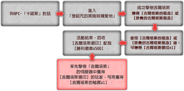 活動期間內,玩家透過風木村的NPC「卡諾斯-訓練隊長」可進入「吉爾塔斯」所在地「受詛咒的黑暗妖精聖地」。※活動期間「受詛咒的黑暗妖精聖地」設定為:角色死亡不掉經驗、角色死亡不掉落物品。