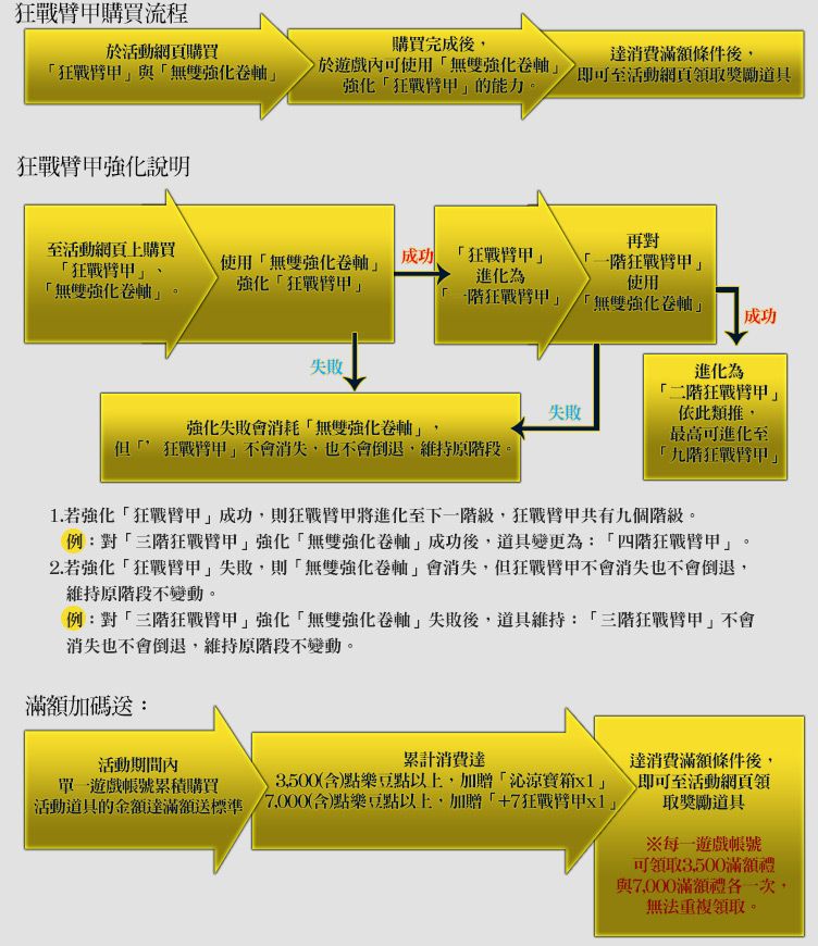 號僅能領取滿額3,500、滿額7,000滿額禮各一次,請玩家特別注意。 - 3.「狂戰臂甲」僅能使用「無雙強化卷軸」進行強化,使用「對盔甲施法的卷軸」、「受祝福的
