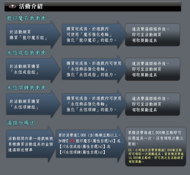 活動時間:2013/10/22 (二) 17:00~ 2013/10/31 (四) 10:30 滿額加碼送:2013/10/22 (二) 17:00~ 2013/10/31 (四) 10:30 活動地點:天堂1 - 52台伺服器。(不含體驗伺服器)
