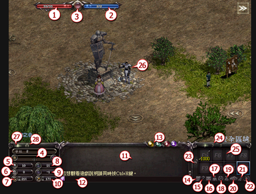 玩家角色永遠在遊戲畫面的中央,滑鼠游標指向人物時,上方會出現角色名稱。