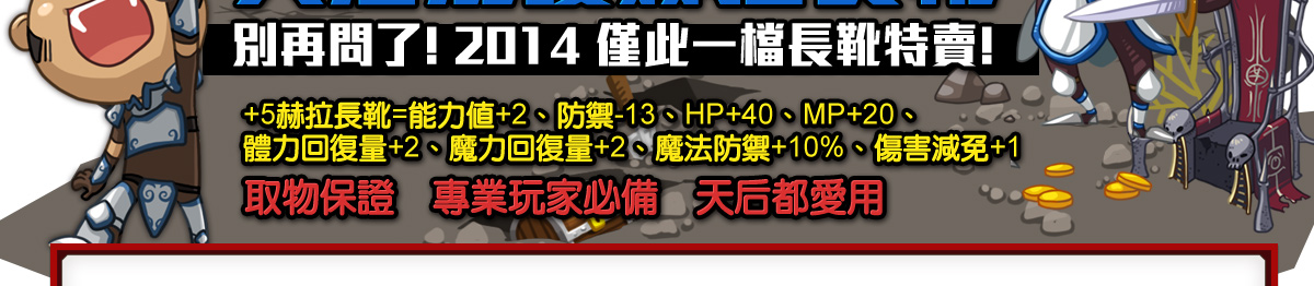 ※2014/11/06(四)維護時,回收2階(含)以下赫拉長靴、兌換憑證、相關活動道具及NPC。 |
