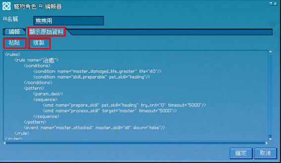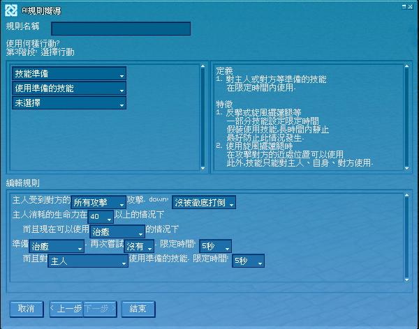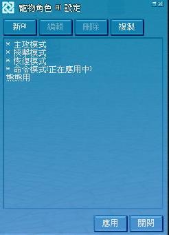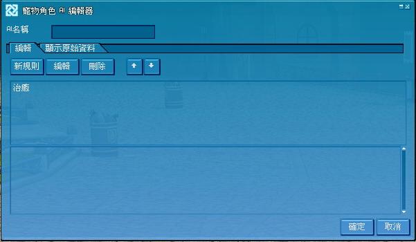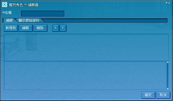 從寵物角色AI設定視窗內,點選[新AI]按鍵,即可打開 [寵物AI角色編輯]視窗。 |
