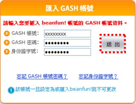輸入您欲合併的GASH帳號、密碼與對應的身分證字號(忘了身分證字號?)