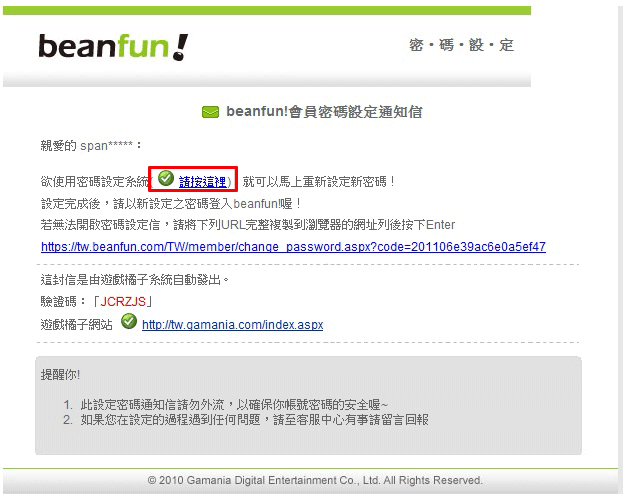 在您的信箱內找到遊戲橘子所寄出的密碼設定通知信,並點選「請按這裡」