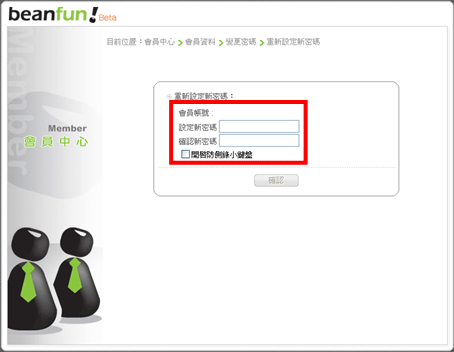 若帳號無誤請在兩個欄位中分別輸入您的新密碼,並點選「確認」完成設定