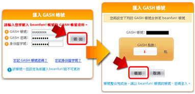 點選「送出」後會顯示該GASH帳號與點數,核對無誤後點選「確認」