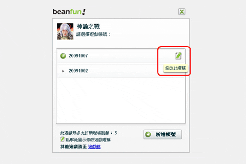 遊戲帳號在創立時最多可顯示中英數合計10個字。若要修改帳號名稱時,請按一下『修改』或是直接在該帳號名稱上點二下即可進行修改。若該款遊戲帳號有二個以上的情況時,必須先點選欲修改的帳號,再按一下『修改』,或是直接在該帳號名稱上點二下即可進行修改。