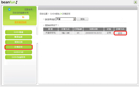 在GASH錢包的『計費設定』功能裡,可以查詢到採用計費制的遊戲帳號相關記錄,您可以看到計費方式、已用點數、到期日期、帳號狀態。需要變更計費方式時,也是由此設定。