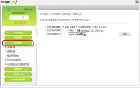 在GASH錢包的『查詢記錄』功能裡,有比照網頁上的會員中心查詢記錄的相關功能喔。在這個地方一樣可以查詢得到帳號的儲值記錄(僅供查詢半年內的記錄)、消費記錄(僅供查詢六個月內的記錄),另外還額外提供了遊戲專用點數的剩餘點數查詢。