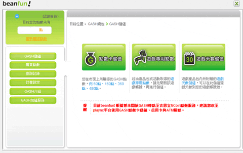 在「遊戲橘子」列上面按一下[GASH錢包]進入功能頁面,此頁面左邊有各項功能列表,在『GASH儲值』功能裡提供一般點數卡儲值、遊戲專用點數儲值、遊戲天數儲值三種。您可依照手邊所擁有的上線儲值密碼類型來選擇儲值的入口。